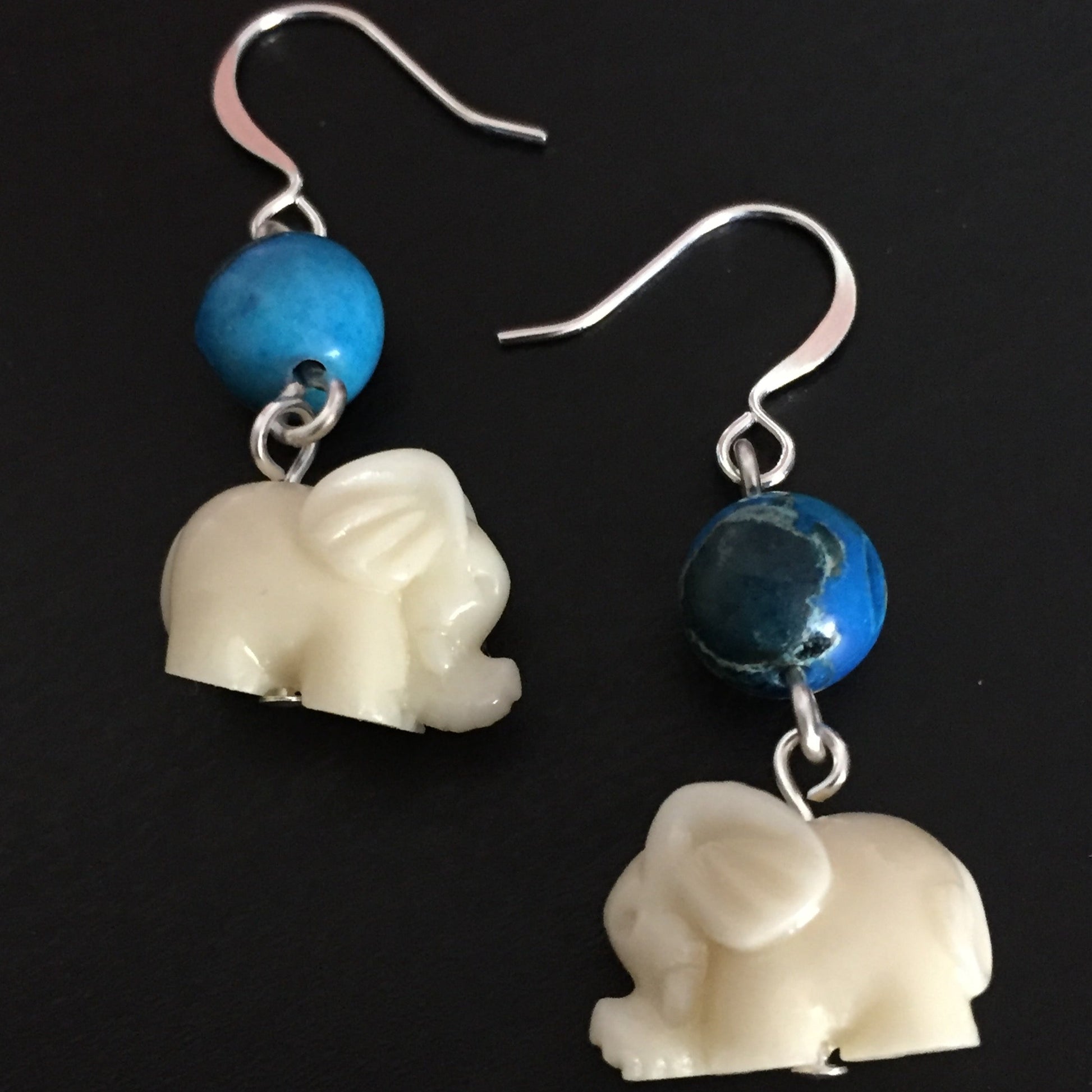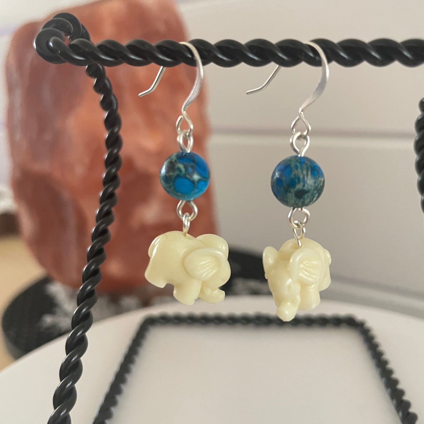 Marbled Blue Jasper & Elephant Shaped Bone Dangle Earrings 1.5" Casual Animal Theme