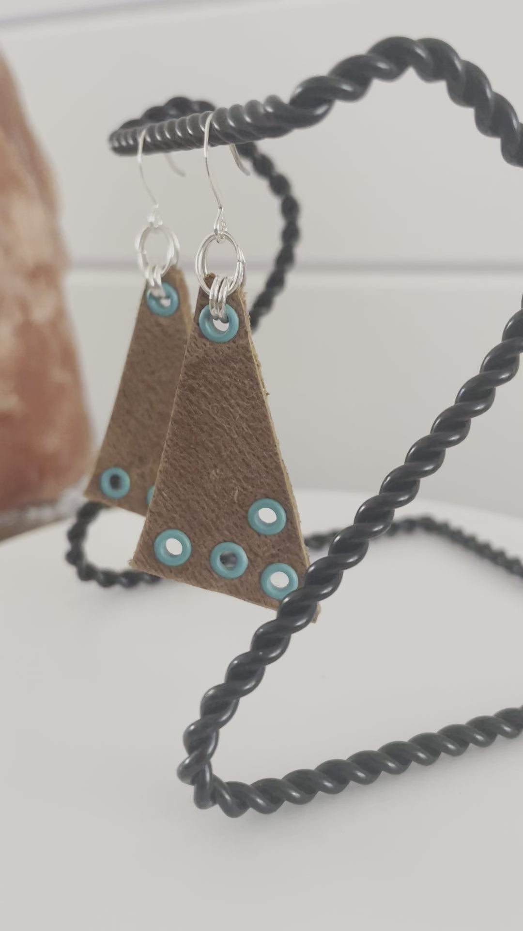 Triangle Leather & Grommet Earrings 2.5" Brown Turquoise Blue Geometric Suede Mixed Metal Fall Winter Autumn